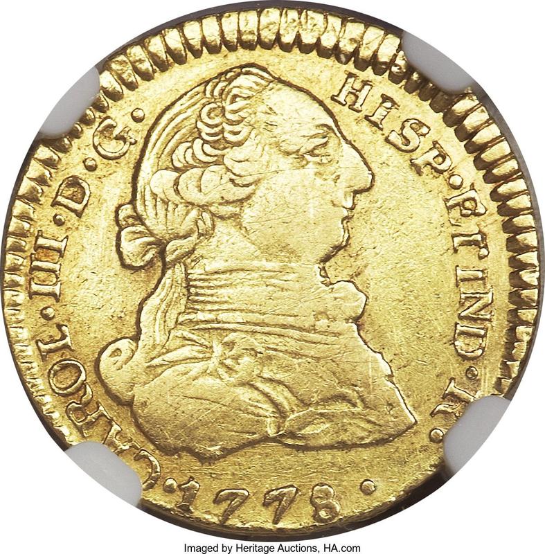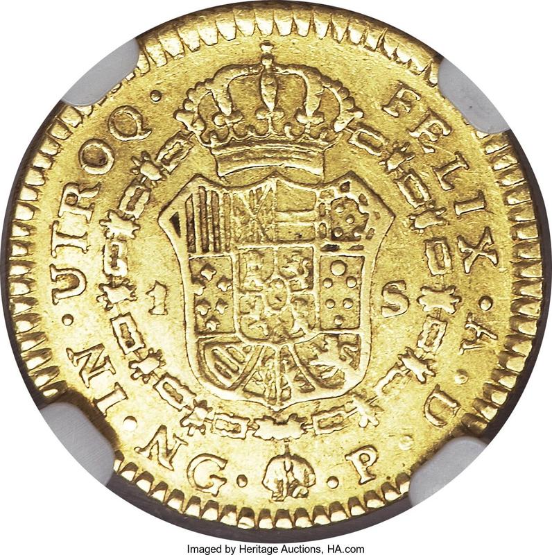 Find out the current coin value of the Guatemalan 1 Escudo 1778 with mark NG P. This gold coin from the times of Charles III struck at the Guatemala Mint. Wondering how much a coin like this is worth? The record price belongs to the lot 24289 sold at the Heritage Auctions auction for USD 16,100. Bidding took place April 15, 2011.