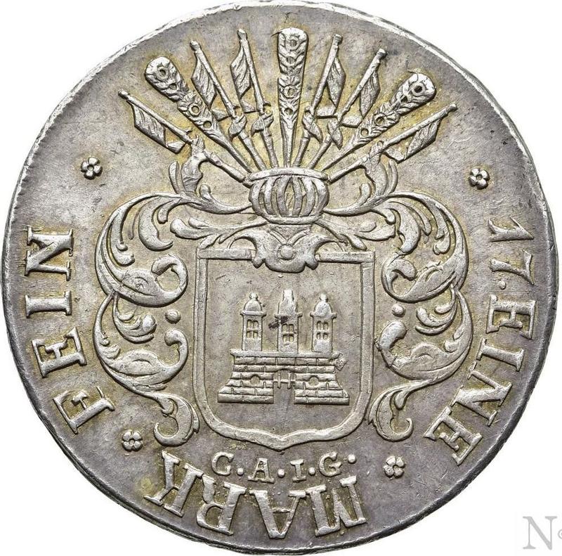 Find out the current coin value of the hamburg 32 Schilling 1809 with mark C.A.I.G.. This silver coin from the times of Free City struck at the Hamburg Mint. Wondering how much a coin like this is worth? The record price belongs to the lot 62489 sold at the Heritage Auctions auction for USD 576. Bidding took place March 9, 2022.