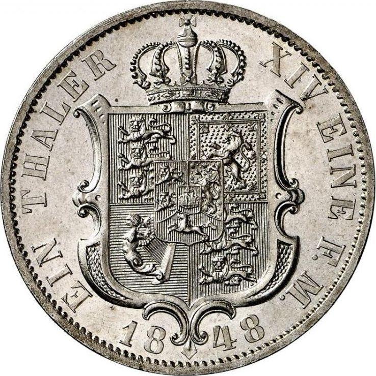Find out the current coin value of the Hanover Thaler 1848 with mark B. This silver coin from the times of Ernest Augustus struck at the Hanover Mint. Wondering how much a coin like this is worth? The record price belongs to the lot 31229 sold at the Heritage Auctions auction for USD 1,140. Bidding took place August 25, 2022.