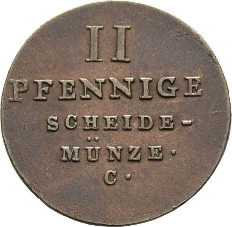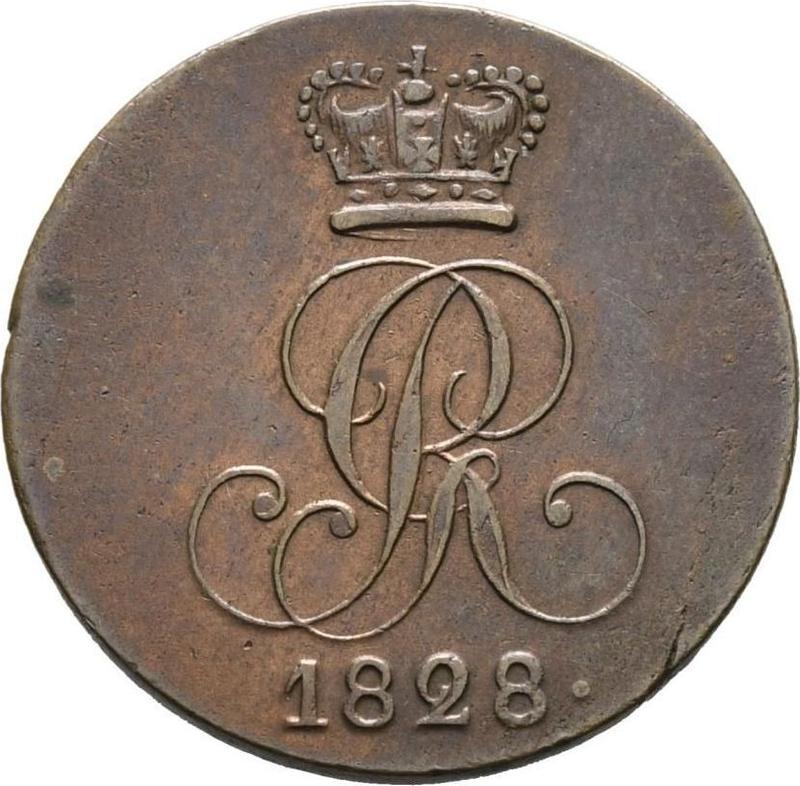 Find out the current coin value of the Hanover 2 Pfennig 1828 with mark C. This copper coin from the times of George IV struck at the Clausthal Mint. Wondering how much a coin like this is worth? The record price belongs to the lot 1015 sold at the Fritz Rudolf Künker GmbH & Co. KG auction for EUR 34. Bidding took place December 4, 2019.
