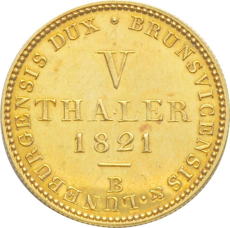 Find out the current coin value of the Hanover 5 Thaler 1821 with mark B. This gold coin from the times of George IV struck at the Hanover Mint. Wondering how much a coin like this is worth? The record price belongs to the lot 4853 sold at the Fritz Rudolf Künker GmbH & Co. KG auction for EUR 4,200. Bidding took place June 20, 2012.