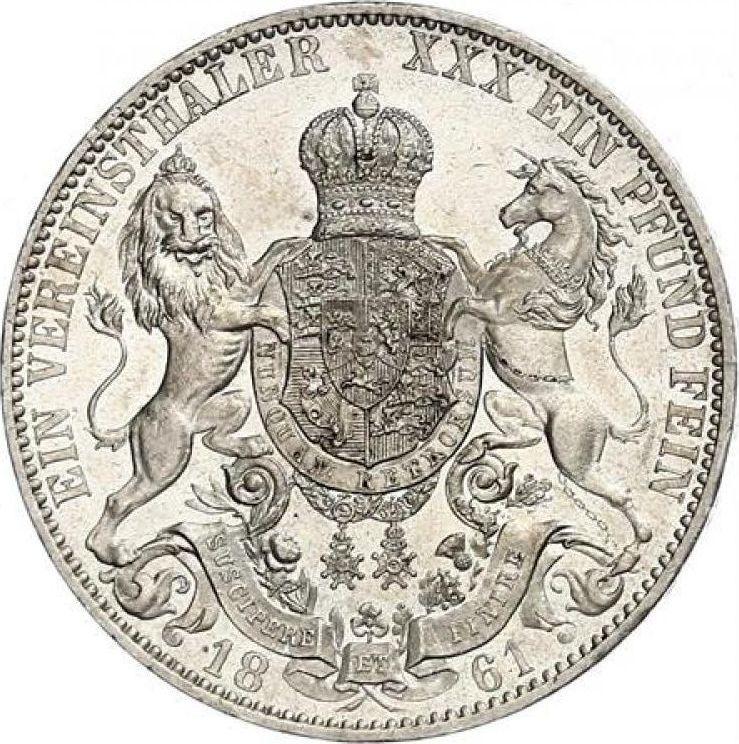 Find out the current coin value of the Hanover Thaler 1861 with mark B. This silver coin from the times of George V struck at the Hanover Mint. Wondering how much a coin like this is worth? The record price belongs to the lot 4931 sold at the Fritz Rudolf Künker GmbH & Co. KG auction for EUR 1,900. Bidding took place June 20, 2012.