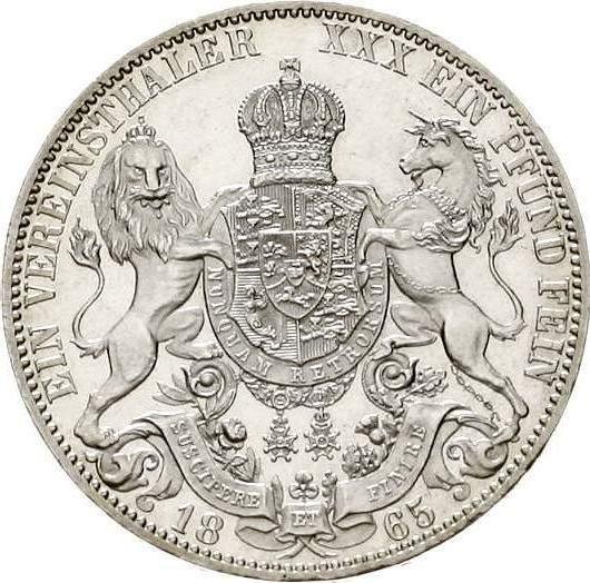 Find out the current coin value of the Hanover Thaler 1865 with mark B. This silver coin from the times of George V struck at the Hanover Mint. Wondering how much a coin like this is worth? The record price belongs to the lot 1783 sold at the Emporium Hamburg Münzhandelsgesellschaft mbH auction for EUR 380. Bidding took place November 14, 2013.