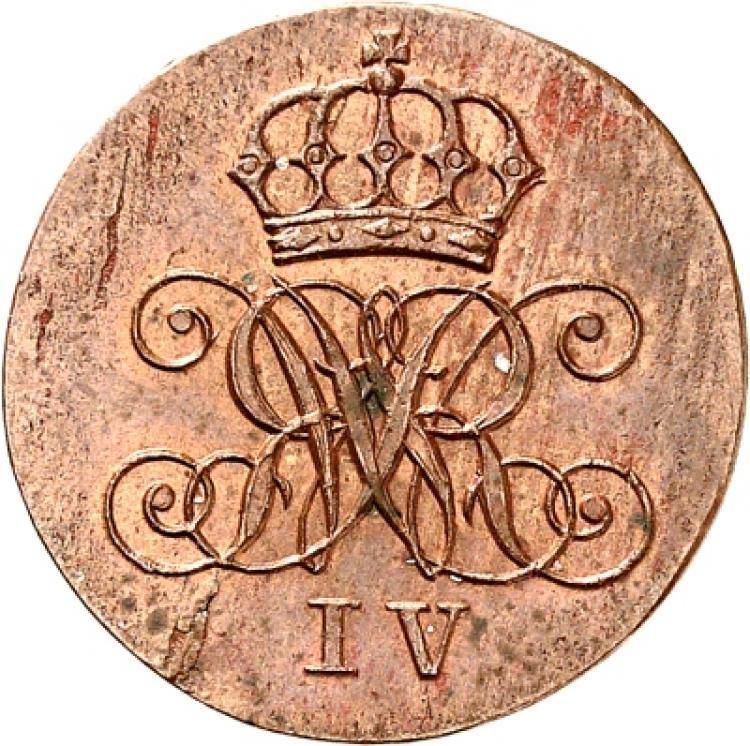 Find out the current coin value of the Hanover 1 Pfennig 1834 with mark A. This copper coin from the times of William IV struck at the Clausthal Mint. Wondering how much a coin like this is worth? The record price belongs to the lot 1322 sold at the Westfälische Auktionsgesellschaft auction for EUR 70. Bidding took place April 28, 2014.