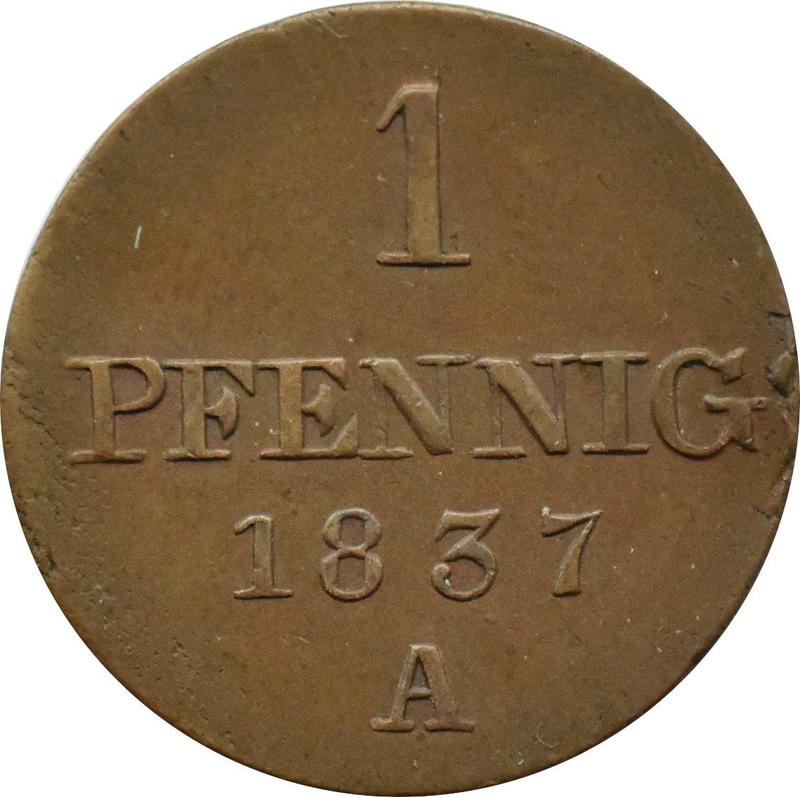 According to the latest data as of December 5, 2025 the average price of a coin 1 Pfennig 1837 with mark A is 10 USD. The coin is made of non-precious metal, so in poor condition it may have extremely low value and liquidity.