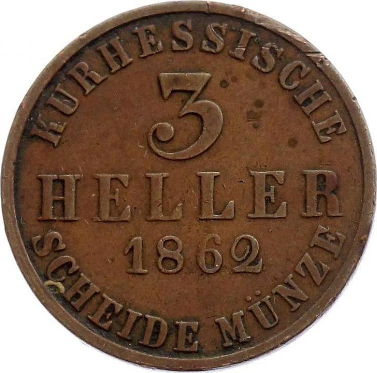 Find out the current coin value of the Hesse-Cassel 3 Heller 1862 . This copper coin from the times of Frederick William I struck at the Kassel Mint. Wondering how much a coin like this is worth? The record price belongs to the lot 1803 sold at the KM NUMIS auction for CZK 100. Bidding took place June 10, 2024.