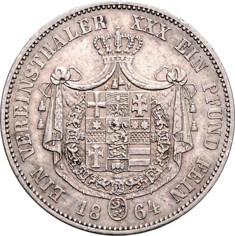 Find out the current coin value of the Hesse-Cassel Thaler 1864 . This silver coin from the times of Frederick William I struck at the Kassel Mint. Wondering how much a coin like this is worth? The record price belongs to the lot 2903 sold at the Emporium Hamburg Münzhandelsgesellschaft mbH auction for EUR 520. Bidding took place November 20, 2023.