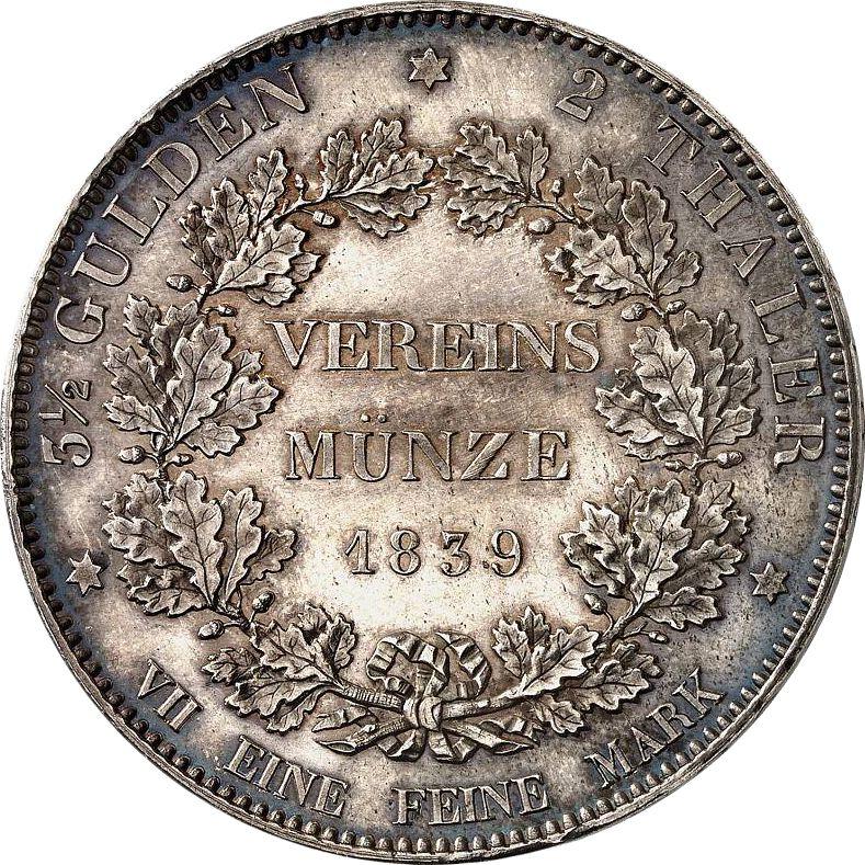 Find out the current coin value of the Hesse-Darmstadt 2 Thaler 1839 . This silver coin from the times of Louis II struck at the Darmstadt Mint. Wondering how much a coin like this is worth? The record price belongs to the lot 1846 sold at the Dr. Busso Peus Nachf. auction for EUR 8,000. Bidding took place April 25, 2012.