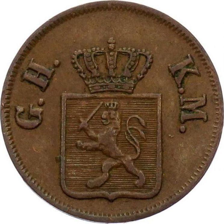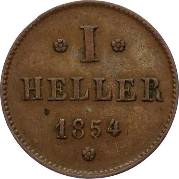 Find out the current coin value of the Hesse-Darmstadt Heller 1854 . This copper coin from the times of Louis III struck at the Darmstadt Mint. Wondering how much a coin like this is worth? The record price belongs to the lot 2096 sold at the Katz Auction auction for EUR 10. Bidding took place November 24, 2018.