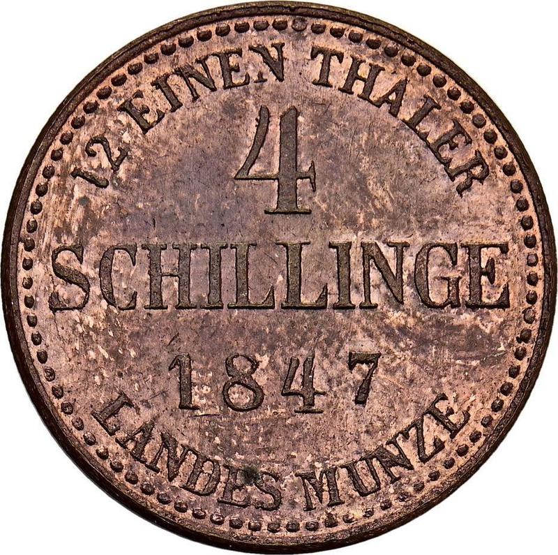 According to the latest data as of December 5, 2025 the average price of a coin 4 Schilling 1847, Copper, One-sided strike of reverse is 230 USD. The coin is made of non-precious metal, so in poor condition it may have extremely low value and liquidity.