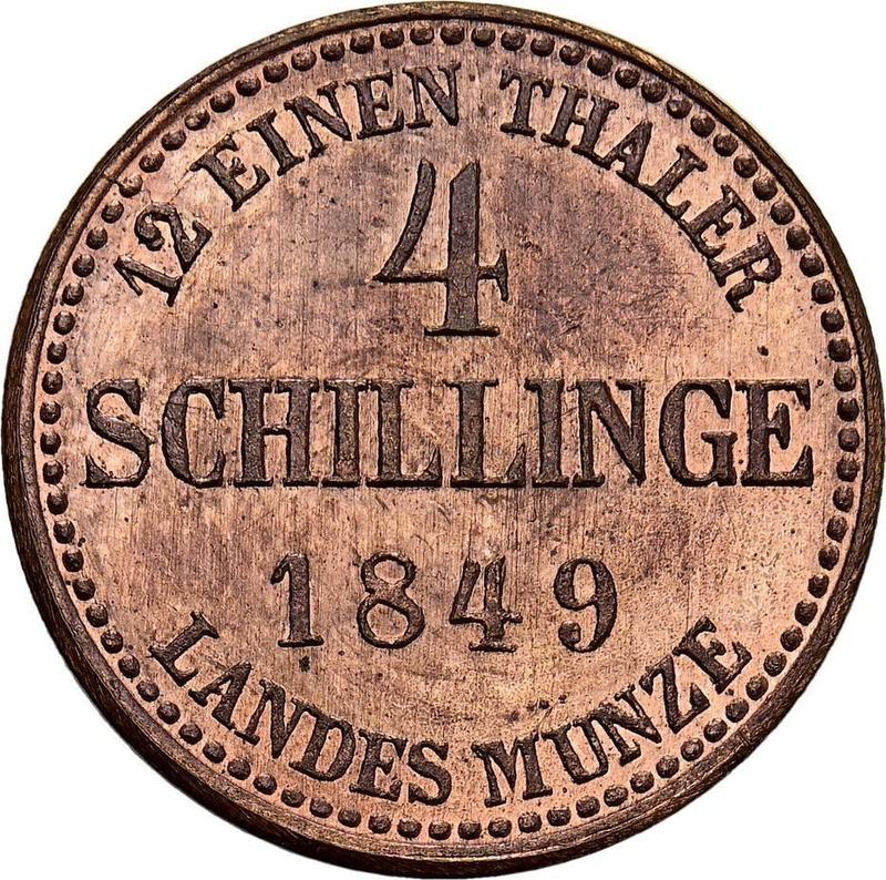 According to the latest data as of December 5, 2025 the average price of a coin 4 Schilling 1849, Copper, One-sided strike of reverse is 230 USD. The coin is made of non-precious metal, so in poor condition it may have extremely low value and liquidity.