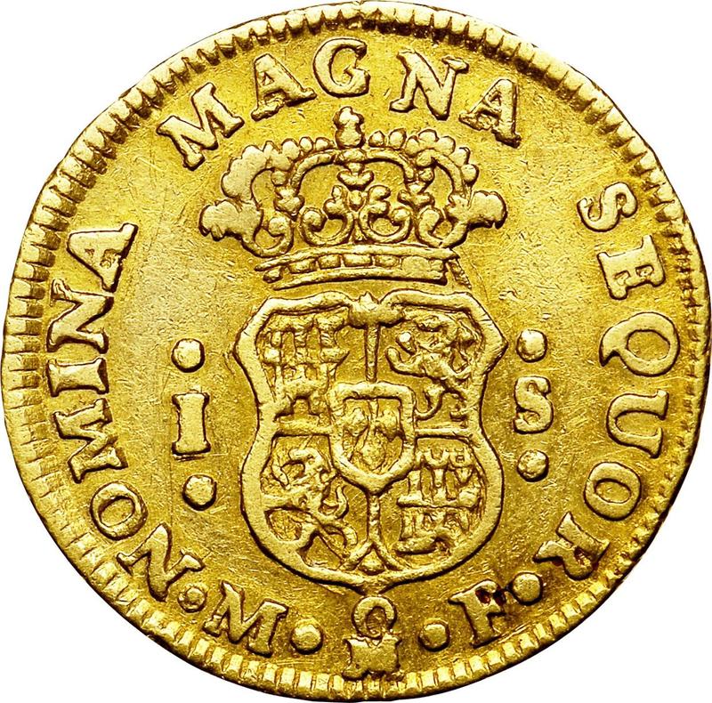 Find out the current coin value of the Mexican 1 Escudo 1749 with mark Mo MF. This gold coin from the times of Ferdinand VI struck at the Mexico City Mint. Wondering how much a coin like this is worth? The record price belongs to the lot 22288 sold at the Heritage Auctions auction for USD 1,093. Bidding took place April 22, 2010.