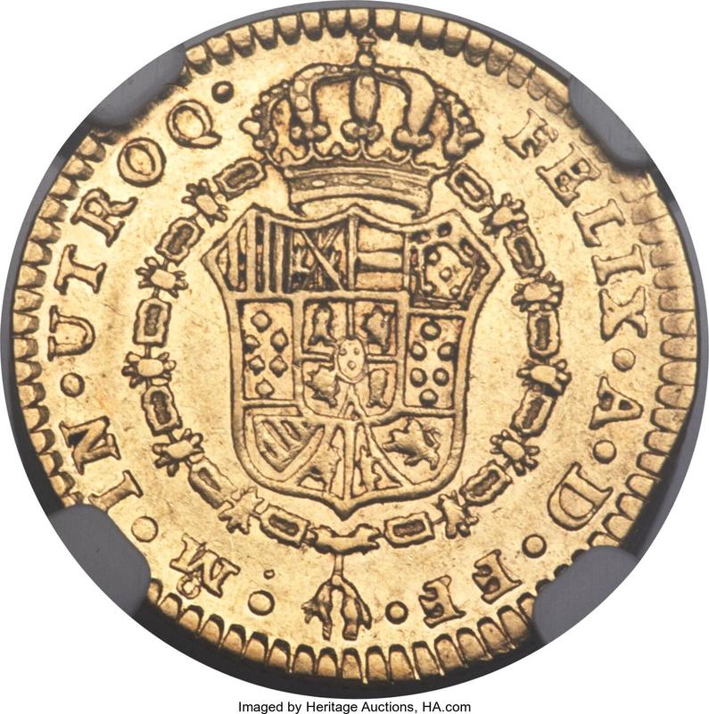 Find out the current coin value of the Mexican 1 Escudo 1784 with mark Mo FF. This gold coin from the times of Charles III struck at the Mexico City Mint. Wondering how much a coin like this is worth? The record price belongs to the lot 41317 sold at the Stack's Bowers auction for USD 5,500. Bidding took place August 26, 2025.