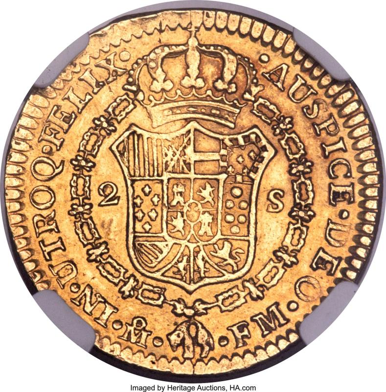 Find out the current coin value of the Mexican 2 Escudos 1795 with mark Mo FM. This gold coin from the times of Charles IV struck at the Mexico City Mint. Wondering how much a coin like this is worth? The record price belongs to the lot 61293 sold at the Heritage Auctions auction for USD 423. Bidding took place October 6, 2016.