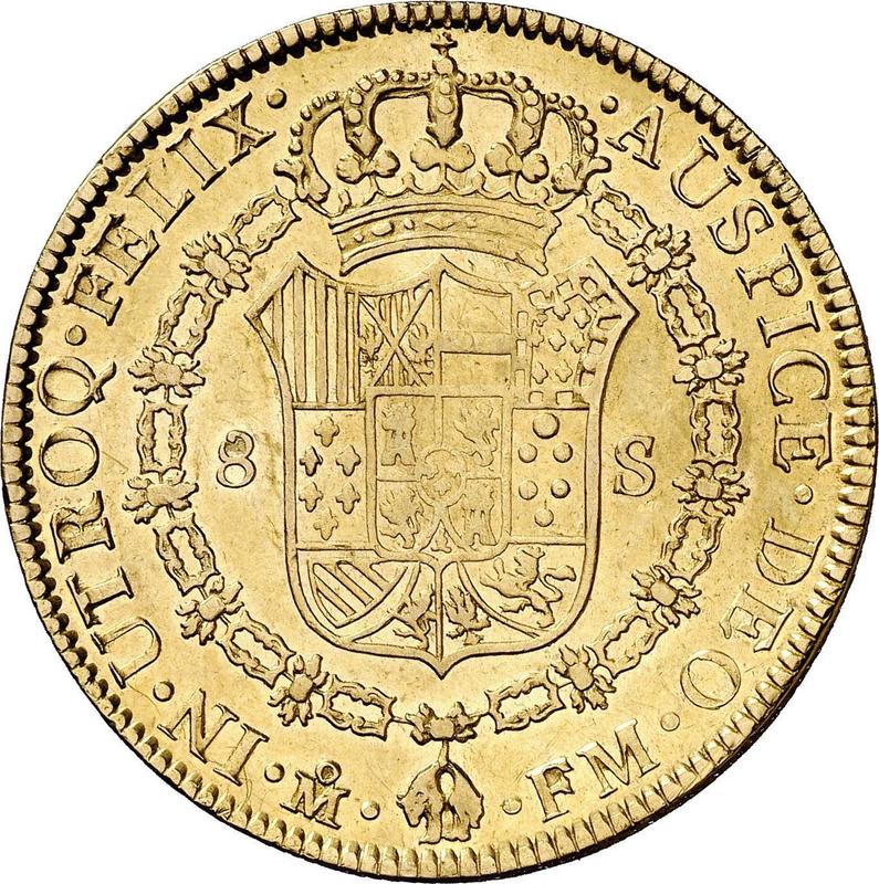 Find out the current coin value of the Mexican 8 Escudos 1790 with mark Mo FM. "CAROL IIII". This gold coin from the times of Charles IV struck at the Mexico City Mint. Wondering how much a coin like this is worth? The record price belongs to the lot 3177 sold at the Stack's Bowers auction for USD 9,200. Bidding took place April 15, 2005.