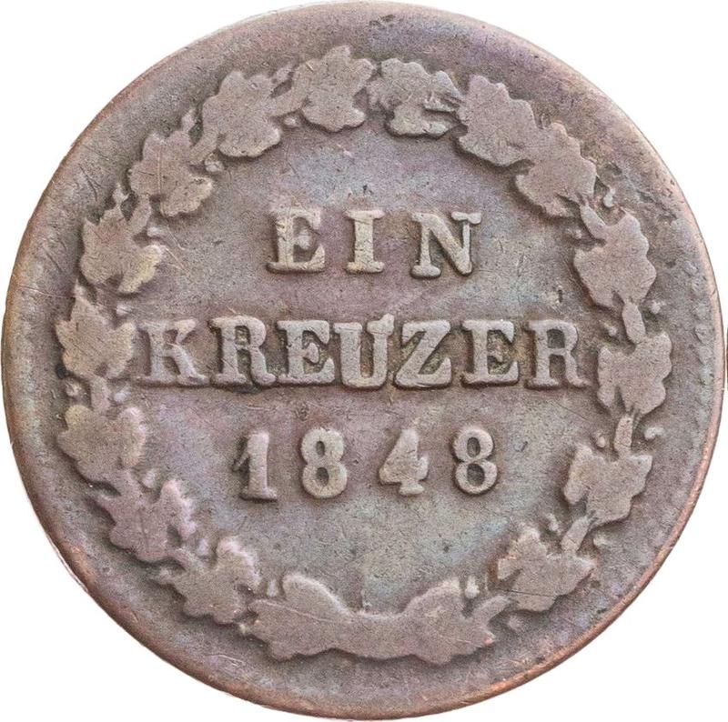 Find out the current coin value of the Nassau Kreuzer 1848 . This copper coin from the times of Adolphe struck at the Please provide the text to be translated from Russian. Mint. Wondering how much a coin like this is worth? The record price belongs to the lot 516 sold at the Katz Auction auction for EUR 15. Bidding took place May 13, 2023.
