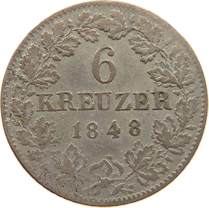 Find out the current coin value of the Nassau 6 Kreuzer 1848 . This silver coin from the times of Adolphe struck at the Please provide the text to be translated from Russian. Mint. Wondering how much a coin like this is worth? The record price belongs to the lot 1854 sold at the Emporium Hamburg Münzhandelsgesellschaft mbH auction for EUR 85. Bidding took place April 22, 2020.