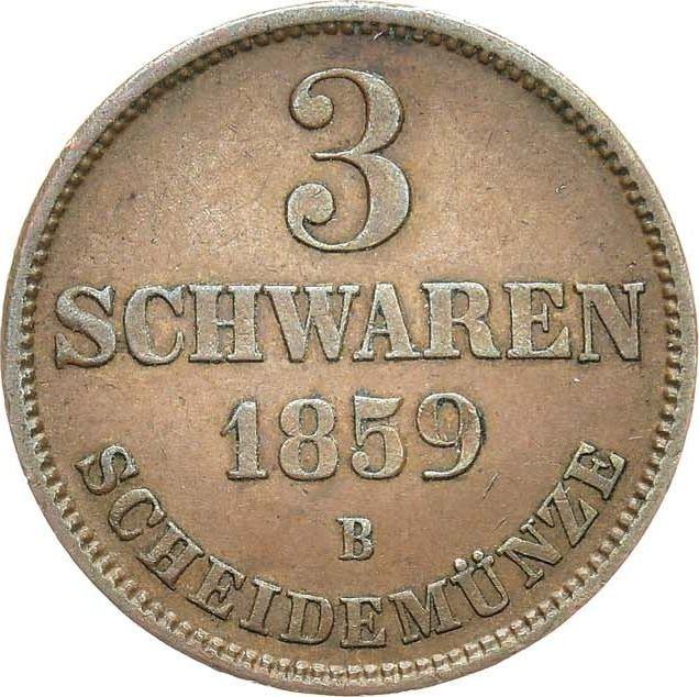 According to the latest data as of December 5, 2025 the average price of a coin 3 Schwaren 1859 with mark B is 6 USD. The coin is made of non-precious metal, so in poor condition it may have extremely low value and liquidity.