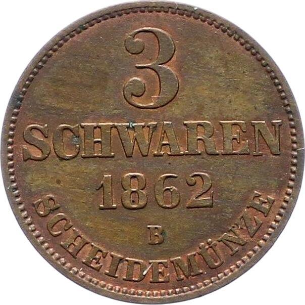 According to the latest data as of December 5, 2025 the average price of a coin 3 Schwaren 1862 with mark B is 10 USD. The coin is made of non-precious metal, so in poor condition it may have extremely low value and liquidity.
