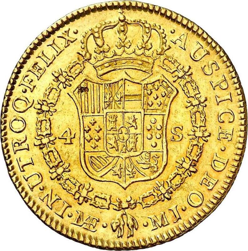 How much is the gold coin of Charles III 4 Escudos 1777 MJ?