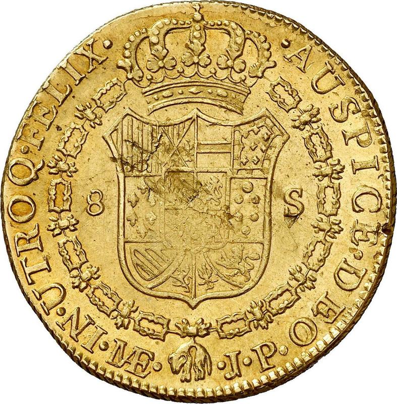 Find out the current coin value of the Peruvian 8 Escudos 1805 with mark JP. This gold coin from the times of Charles IV struck at the Lima Mint. Wondering how much a coin like this is worth? The record price belongs to the lot 3067 sold at the Auction World auction for JPY 620,000. Bidding took place July 15, 2023.