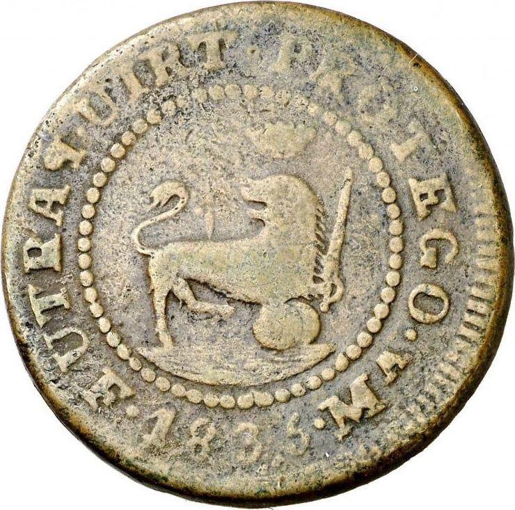 According to the latest data as of December 5, 2025 the average price of a coin 4 Cuartos 1835 with mark Ma MR is 3200 USD. The coin is made of non-precious metal, so in poor condition it may have extremely low value and liquidity.
