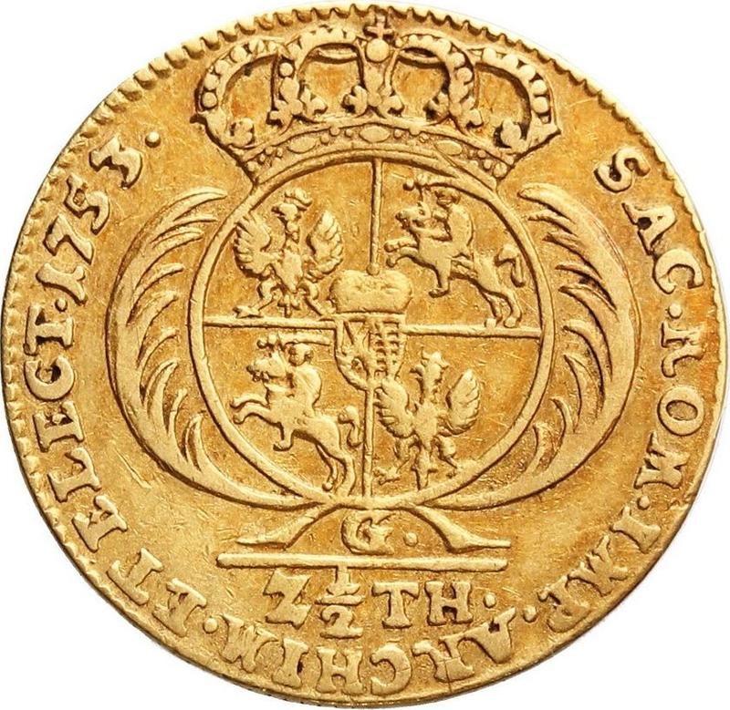 Find out the current coin value of the Polish 2-1/2 Thaler (1/2 August d'or) 1753 "Crown" with mark G. This gold coin from the times of Augustus III struck at the Leipzig Mint. Wondering how much a coin like this is worth? The record price belongs to the lot 136 sold at the NIEMCZYK - Dom Aukcyjny auction for PLN 19,000. Bidding took place October 21, 2012.