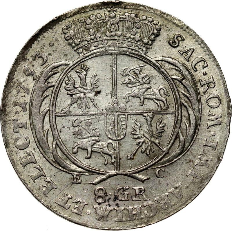 Find out the current coin value of the Polish 2 Zlote (8 Groszy) 1753 ""8 GR"" with mark EC. This silver coin from the times of Augustus III struck at the Leipzig Mint. Wondering how much a coin like this is worth? The record price belongs to the lot 64558 sold at the Heritage Auctions auction for USD 960. Bidding took place March 24, 2021.