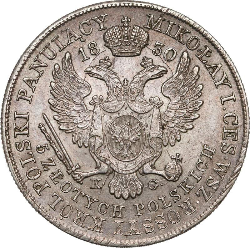 Find out the current coin value of the Polish 5 Zlotych 1830 with mark KG. This silver coin from the times of Congress Poland struck at the Warsaw Mint. Wondering how much a coin like this is worth? The record price belongs to the lot 497 sold at the WDA - MiM auction for PLN 15,500. Bidding took place November 18, 2025.