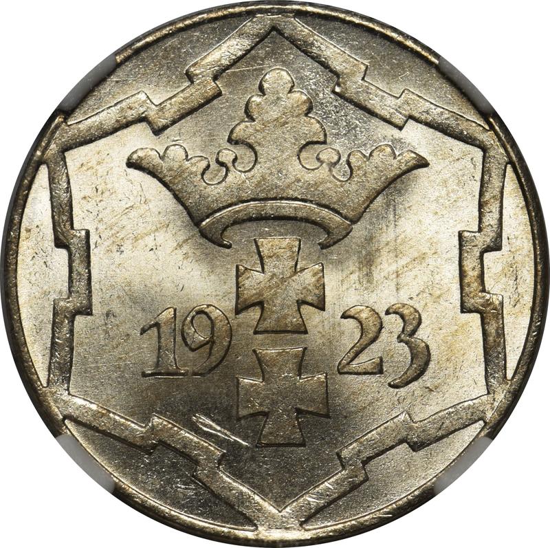 Find out the current coin value of the Polish 10 Pfennig 1923 . This copper-nickel coin from the times of Free City of Danzig struck at the Berlin Mint. Wondering how much a coin like this is worth? The record price belongs to the lot 23001 sold at the Heritage Auctions auction for USD 2,280. Bidding took place October 21, 2025.