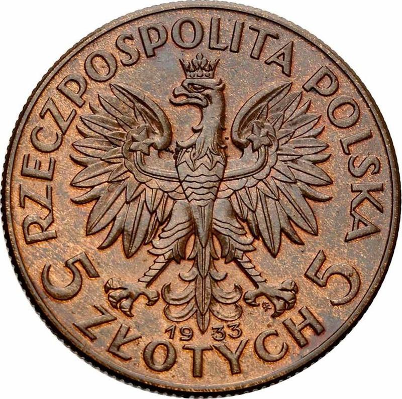Find out the current coin value of the Polish Pattern 5 Zlotych 1933 "Polonia". Bronze. This bronze coin from the times of II Republic struck at the Warsaw Mint. Wondering how much a coin like this is worth? The record price belongs to the lot 423 sold at the Dom Aukcyjny Numimarket.pl auction for PLN 48,000. Bidding took place April 14, 2024.