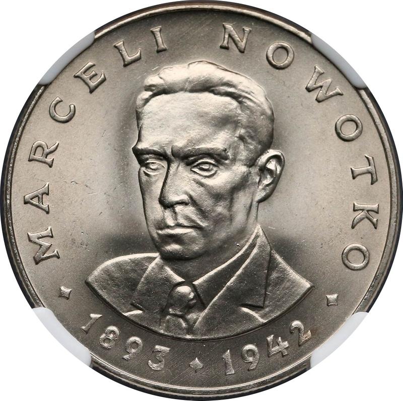 Find out the current coin value of the Polish 20 Zlotych 1976 "Marceli Nowotko" with mark MW. This copper-nickel coin from the times of Peoples Republic struck at the Warsaw Mint. Wondering how much a coin like this is worth? The record price belongs to the lot 741 sold at the WDA - MiM auction for PLN 950. Bidding took place December 29, 2020.