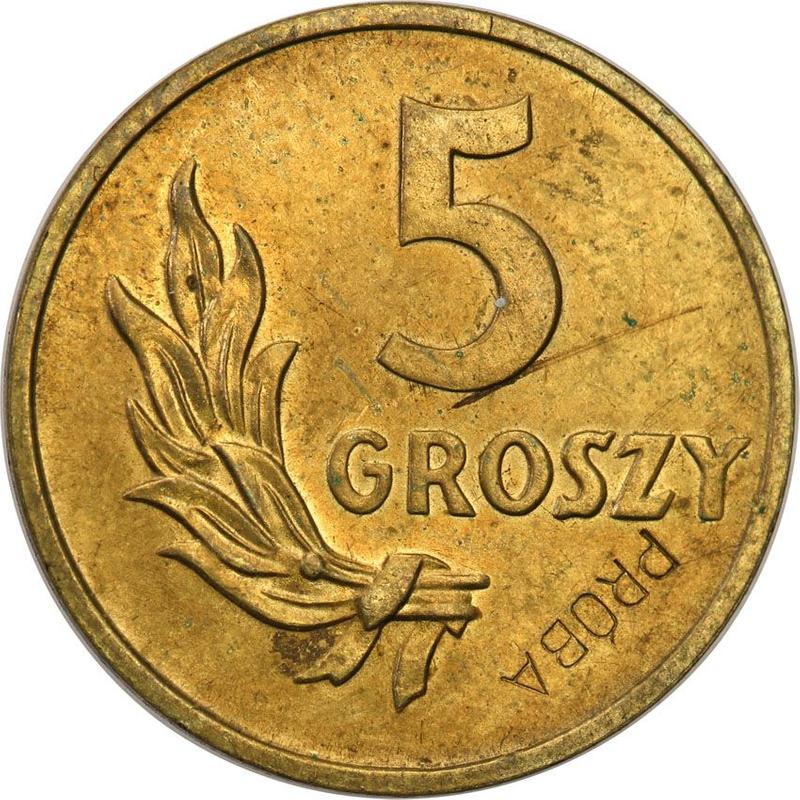 Find out the current coin value of the Polish Pattern 5 Groszy 1949 . Brass. This brass coin from the times of Peoples Republic struck at the Warsaw Mint. Wondering how much a coin like this is worth? The record price belongs to the lot 722 sold at the Warszawskie Centrum Numizmatyczne auction for PLN 3,000. Bidding took place May 31, 2008.