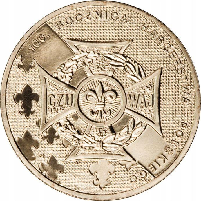 Find out the current coin value of the Polish 2 Zlote 2010 "100 years of Polish Scouting Association" with mark MW KK. This brass coin from the times of III Republic after denomination struck at the Warsaw Mint