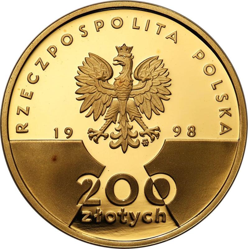 Find out the current coin value of the Polish 200 Zlotych 1998 "20th anniversary of John Paul's II pontificate" with mark MW EO. This gold coin from the times of III Republic after denomination struck at the Warsaw Mint. Wondering how much a coin like this is worth? The record price belongs to the lot 1138 sold at the Rzeszowski Dom Aukcyjny auction for PLN 6,000. Bidding took place September 6, 2025.