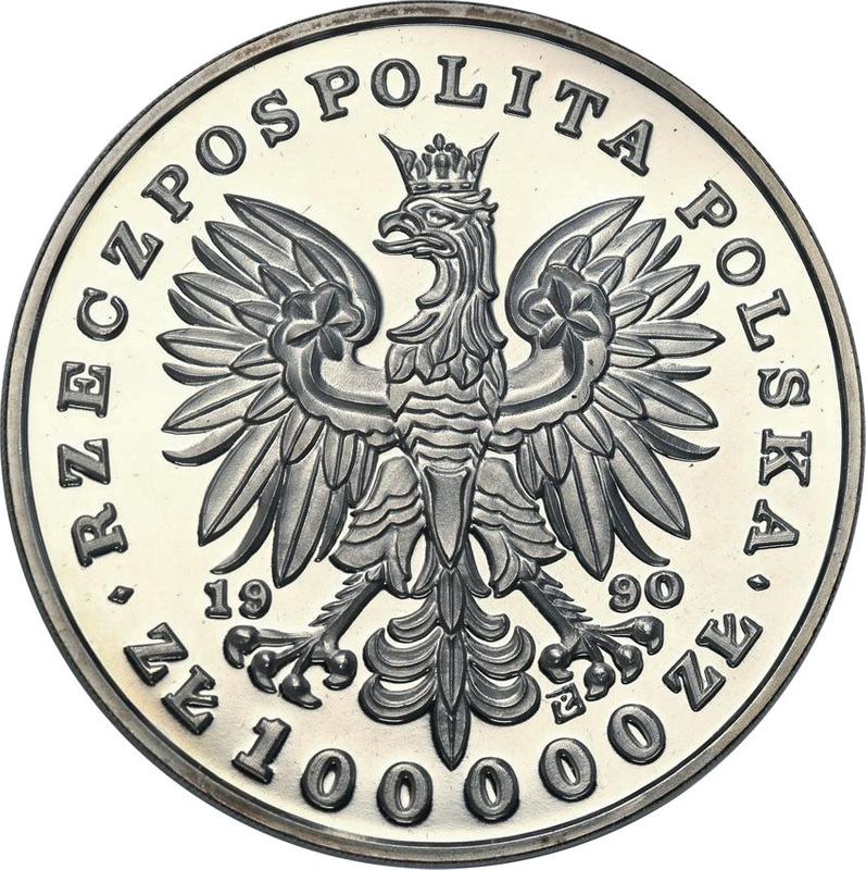 Find out the current coin value of the Polish 100000 Zlotych 1990 "200th Anniversary of the Death of Tadeusz Kosciuszko". This silver coin from the times of III Republic before denomination struck at the Philadelphia Mint. Wondering how much a coin like this is worth? The record price belongs to the lot 852 sold at the WÓJCICKI Polski Dom Aukcyjny auction for PLN 3,200. Bidding took place February 26, 2022.