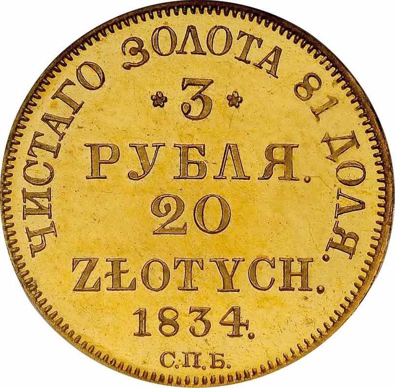 How much is the gold coin of Russian protectorate 3 Rubles - 20 Zlotych 1834 СПБ ПД?