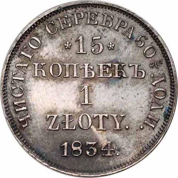 According to the latest data as of December 5, 2025 the average price of a Silver coin 15 Kopeks - 1 Zloty 1834 with mark НГ is 120 USD for regular strike and 7800 USD for coins minted using the PROOF technology.