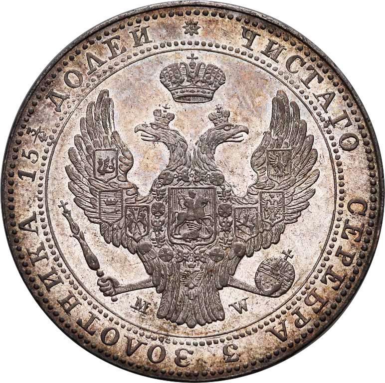 According to the latest data as of December 5, 2025 the average price of a Silver coin 3/4 Rouble - 5 Zlotych 1840 with mark MW, Narrow tail is 170 USD.