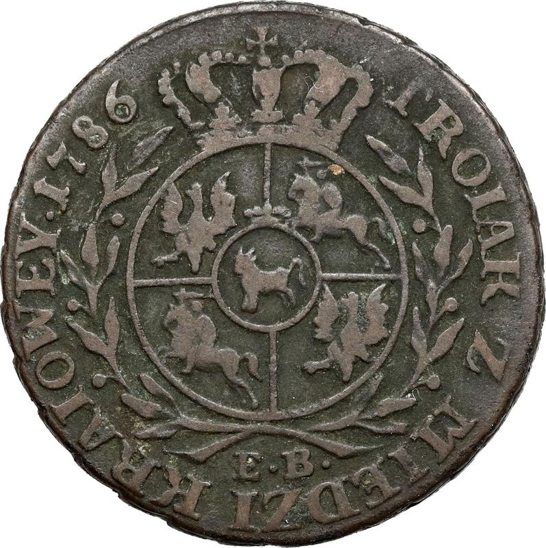 Find out the current coin value of the Polish 3 Groszy (Trojak) 1786 "Z MIEDZI KRAIOWEY" with mark EB. This copper coin from the times of Stanislaw Augustus struck at the Warsaw Mint. Wondering how much a coin like this is worth? The record price belongs to the lot 645 sold at the Warszawskie Centrum Numizmatyczne auction for PLN 5,500. Bidding took place November 7, 2015.