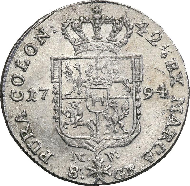 Find out the current coin value of the Polish 2 Zlote (8 Groszy) 1794 "Kościuszko Uprising" with mark MV. Inscription 42 1/4. This silver coin from the times of Stanislaw Augustus struck at the Warsaw Mint. Wondering how much a coin like this is worth? The record price belongs to the lot 163 sold at the WÓJCICKI Polski Dom Aukcyjny auction for PLN 8,000. Bidding took place September 14, 2019.