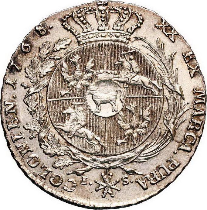 Find out the current coin value of the Polish 1/2 Thaler 1768 "Without ribbon in hair" with mark IS. This silver coin from the times of Stanislaw Augustus struck at the Warsaw Mint. Wondering how much a coin like this is worth? The record price belongs to the lot 165 sold at the NIEMCZYK - Dom Aukcyjny auction for PLN 28,000. Bidding took place October 25, 2014.