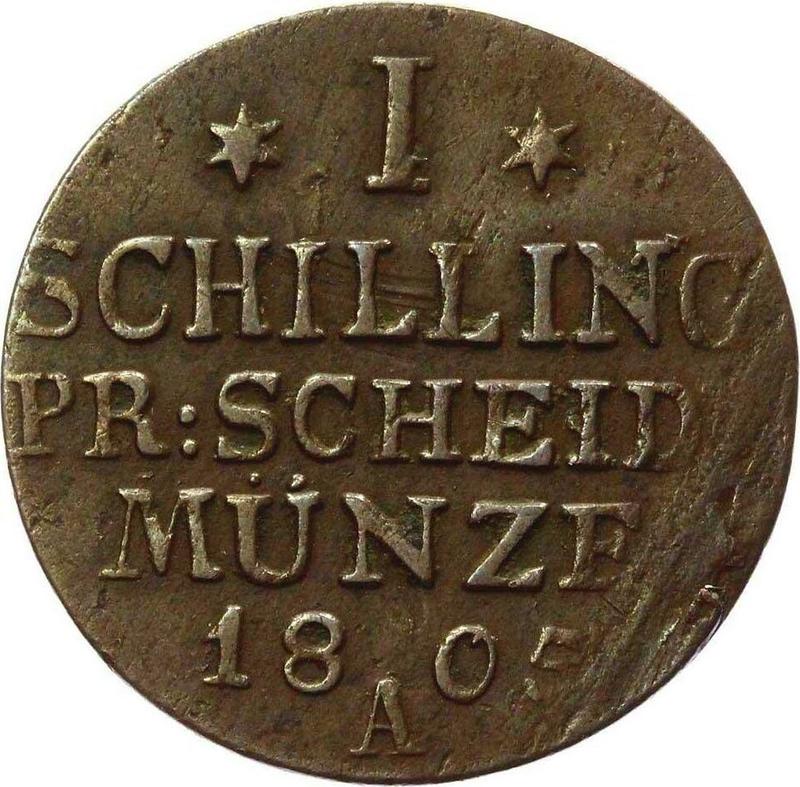Find out the current coin value of the Prussian Schilling 1805 with mark A. This copper coin from the times Frederick William III struck at the Berlin Mint. Wondering how much a coin like this is worth? The record price belongs to the lot 1010 sold at the BERLINER MÜNZAUKTION auction for EUR 90. Bidding took place March 22, 2025.