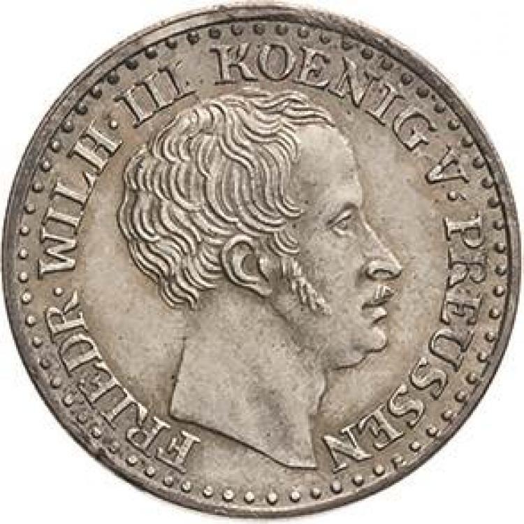 Find out the current coin value of the Prussian Silber Groschen 1827 with mark A. This silver coin from the times Frederick William III struck at the Berlin Mint. Wondering how much a coin like this is worth? The record price belongs to the lot 1821 sold at the Emporium Hamburg Münzhandelsgesellschaft mbH auction for EUR 170. Bidding took place November 15, 2012.