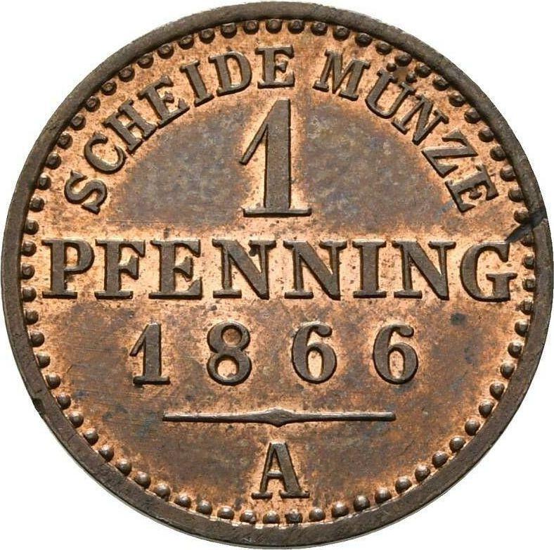 The information on the current value of the Prussian coin 1 Pfennig 1866 with the letters A is based on actual auction sales of similar specimens. To reflect the current price level, our service monitors over 590 numismatic companies and records auction results in the coin catalog and auction archive. Please note that the exact value depends directly on the coin's condition, so the average price serves only as an approximate estimate.