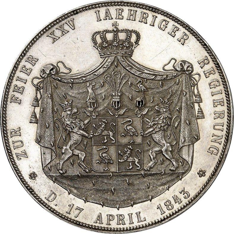 According to the latest data as of December 5, 2025 the average price of a Silver coin 2 Thaler 1843 "25 years of the reign of Henry LXII" with mark A is 3100 USD for regular strike and 5800 USD for coins minted using the PROOF technology.