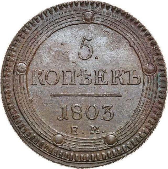 According to the latest data as of December 5, 2025 the average price of a coin 5 Kopeks 1803 "Yekaterinburg Mint" with mark ЕМ, Type 1802 is 170 USD. The coin is made of non-precious metal, so in poor condition it may have extremely low value and liquidity.