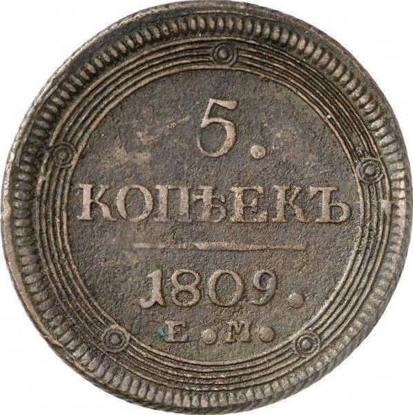 According to the latest data as of December 6, 2025 the average price of a coin 5 Kopeks 1809 "Yekaterinburg Mint" with mark ЕМ, Big crown is 2200 USD. The coin is made of non-precious metal, so in poor condition it may have extremely low value and liquidity.
