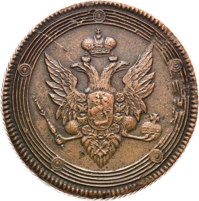 Find out the current coin value of the Russian 5 Kopeks 1809 "Yekaterinburg Mint" with mark ЕМ. Small crown. This copper coin from the times of Alexander I struck at the Yekaterinburg Mint. Wondering how much a coin like this is worth? The record price belongs to the lot 120 sold at the MS67 auction for RUB 220,000. Bidding took place July 2, 2025.