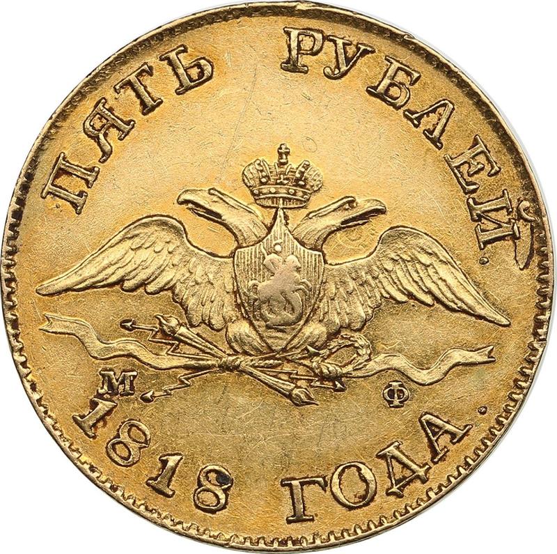 Find out the current coin value of the Russian 5 Roubles 1818 "An eagle with lowered wings" with mark СПБ МФ. This gold coin from the times of Alexander I struck at the Saint Petersburg Mint. Wondering how much a coin like this is worth? The record price belongs to the lot 96 sold at the Alexander auction for RUB 2,815,408. Bidding took place May 16, 2024.